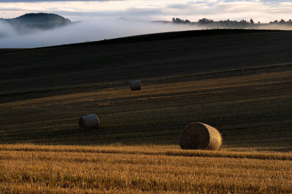 朝靄と麦稈ロール