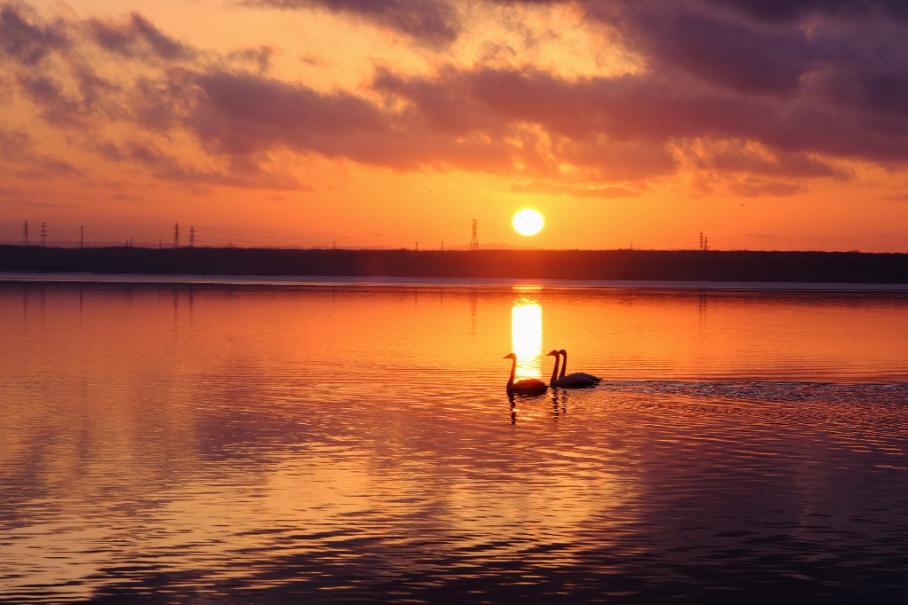 朝陽に染まるウトナイ湖と白鳥