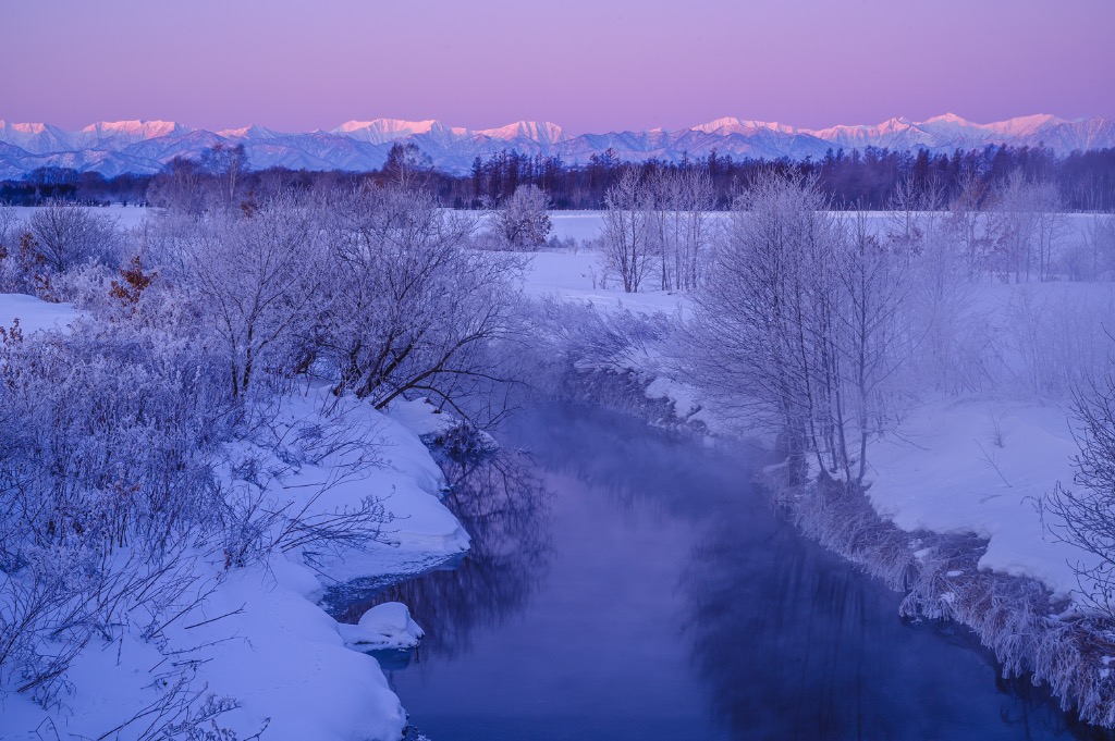 更別川とピンクに染まる日高山脈